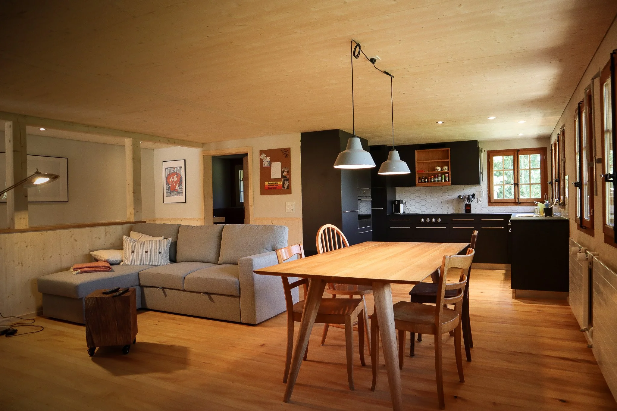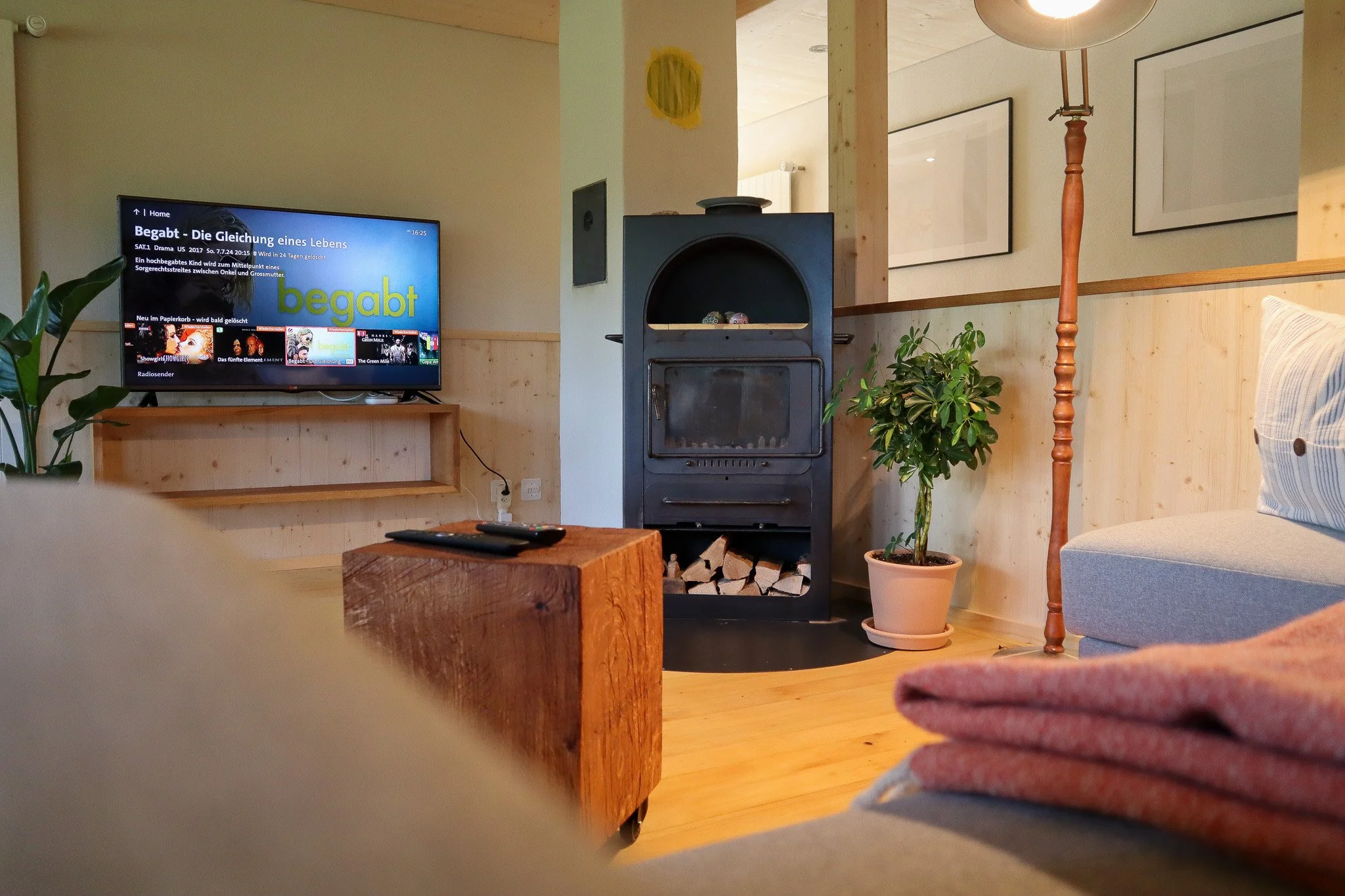 Wohn- und Esszimmer mit einem Schlafsofa 140x 200cm, TV mit 7 Tagen Replay und HDMI Kabel, Schwedenofen und einem Esstisch für 6 Personen.